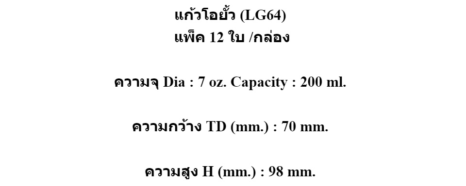 แก้วโอยั้ว (LG64) แพ็ค 12 ใบ /กล่อง ความจุ Dia : 7 oz. Capacity : 200 ml. ความกว้าง TD (mm.) : 70 mm. ความสูง H (mm.) : 98 mm.