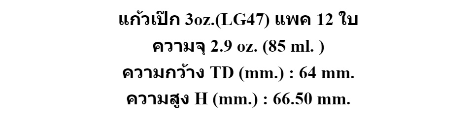 แก้วเป๊ก 3oz.(LG47) แพค 12 ใบ ความจุ 2.9 oz. (85 ml. ) ความกว้าง TD (mm.) : 64 mm. ความสูง H (mm.) : 66.50 mm.