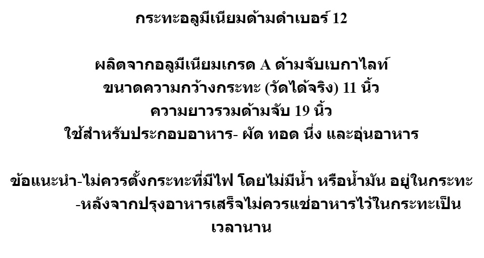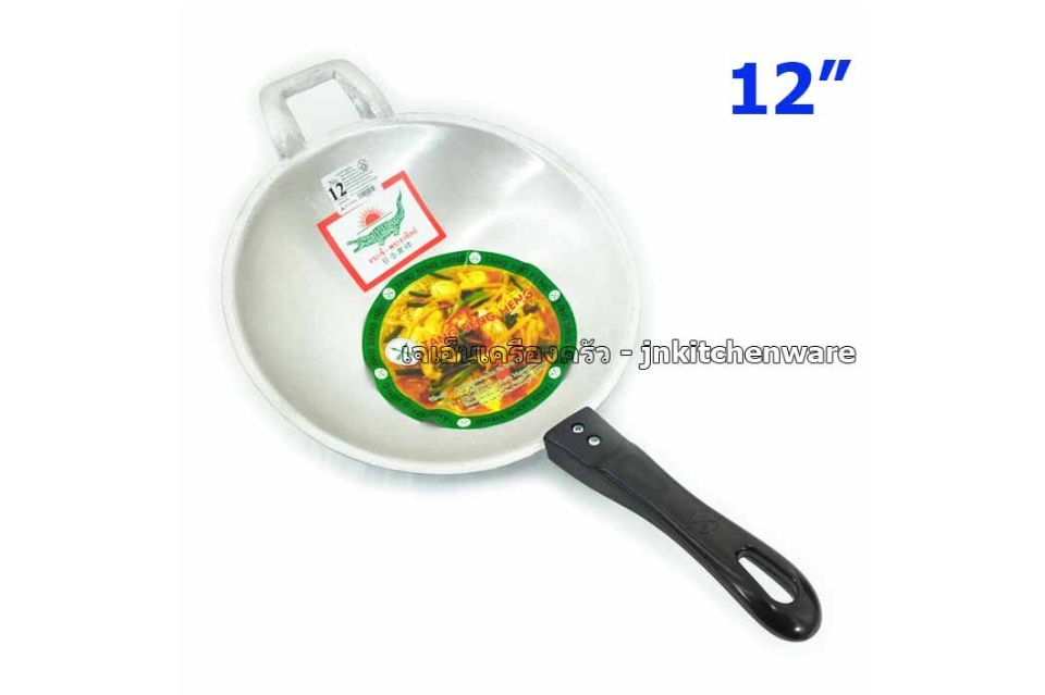 กระทะอลูมีเนียมด้ามดำเบอร์ 12 ผลิตจากอลูมีเนียมเกรด A ด้ามจับเบกาไลท์ ขนาดความกว้างกระทะ (วัดได้จริง) 11 นิ้ว ความยาวรวมด้ามจับ 19 นิ้ว ใช้สำหรับประกอบอาหาร- ผัด ทอด นึ่ง และอุ่นอาหาร ข้อแนะนำ-ไม่ควรตั้งกระทะที่มีไฟ โดยไม่มีน้ำ หรือน้ำมัน อยู่ในกระทะ -หลังจากปรุงอาหารเสร็จไม่ควรแช่อาหารไว้ในกระทะเป็นเวลานาน