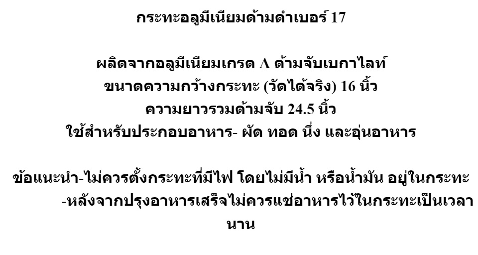 กระทะอลูมีเนียมด้ามดำเบอร์ 17 ผลิตจากอลูมีเนียมเกรด A ด้ามจับเบกาไลท์ ขนาดความกว้างกระทะ (วัดได้จริง) 16 นิ้ว ความยาวรวมด้ามจับ 24.5 นิ้ว ใช้สำหรับประกอบอาหาร- ผัด ทอด นึ่ง และอุ่นอาหาร ข้อแนะนำ-ไม่ควรตั้งกระทะที่มีไฟ โดยไม่มีน้ำ หรือน้ำมัน อยู่ในกระทะ -หลังจากปรุงอาหารเสร็จไม่ควรแช่อาหารไว้ในกระทะเป็นเวลานาน