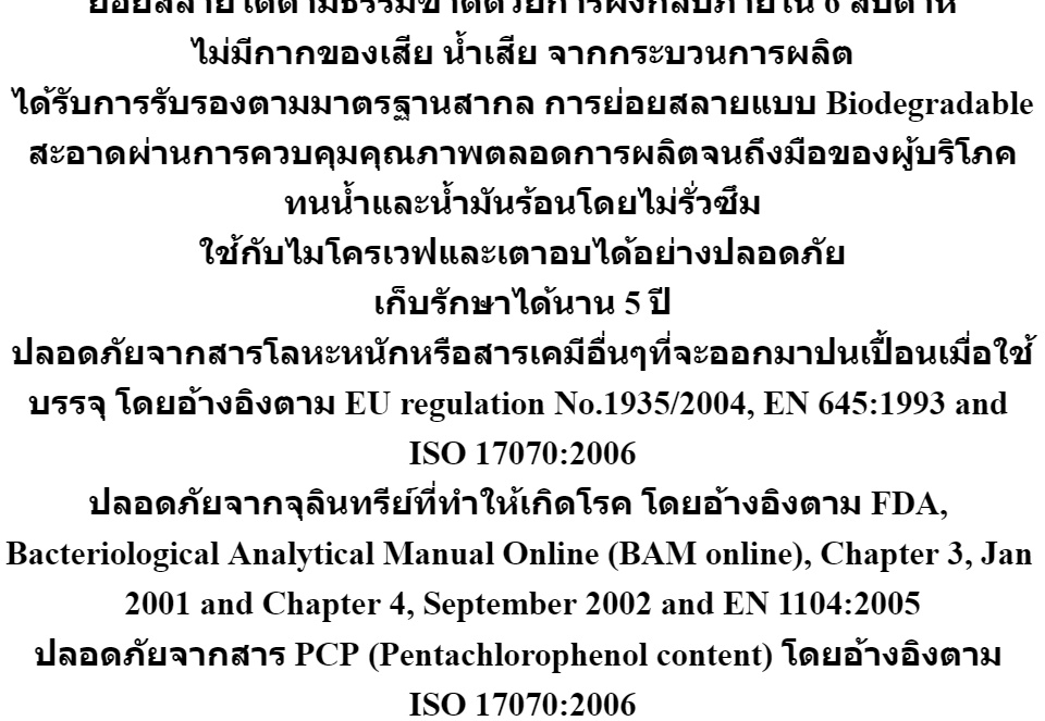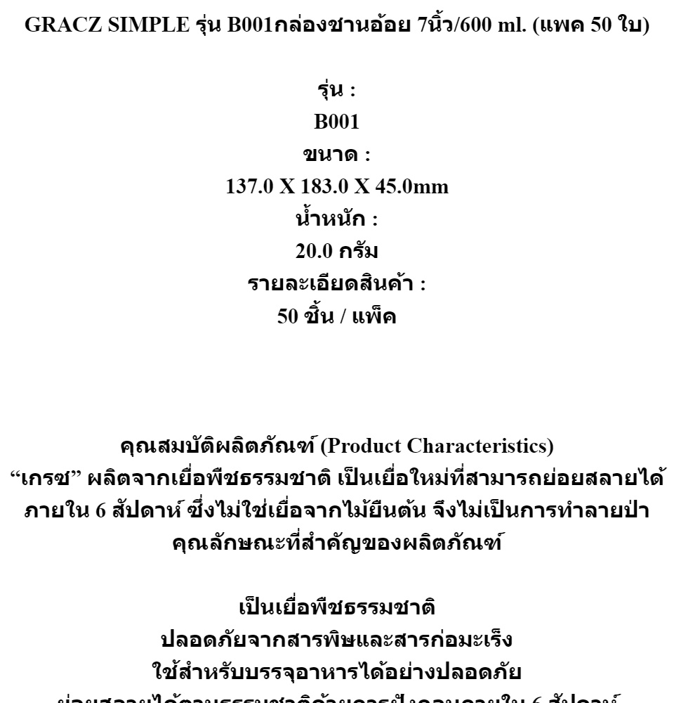 GRACZ SIMPLE รุ่น B001กล่องชานอ้อย 7นิ้ว/600 ml. (แพค 50 ใบ) รุ่น : B001 ขนาด : 137.0 X 183.0 X 45.0mm น้ำหนัก : 20.0 กรัม รายละเอียดสินค้า : 50 ชิ้น / แพ็ค คุณสมบัติผลิตภัณฑ์ (Product Characteristics) “เกรซ” ผลิตจากเยื่อพืชธรรมชาติ เป็นเยื่อใหม่ที่สามารถย่อยสลายได้ภายใน 6 สัปดาห์ ซึ่งไม่ใช่เยื่อจากไม้ยืนต้น จึงไม่เป็นการทำลายป่า คุณลักษณะที่สําคัญของผลิตภัณฑ์ เป็นเยื่อพืชธรรมชาติ ปลอดภัยจากสารพิษและสารก่อมะเร็ง ใช้สําหรับบรรจุอาหารได้อย่างปลอดภัย ย่อยสลายได้ตามธรรมชาติด้วยการฝังกลบภายใน 6 สัปดาห์ ไม่มีกากของเสีย น้ำเสีย จากกระบวนการผลิต ได้รับการรับรองตามมาตรฐานสากล การย่อยสลายแบบ Biodegradable สะอาดผ่านการควบคุมคุณภาพตลอดการผลิตจนถึงมือของผู้บริโภค ทนน้ำและน้ำมันร้อนโดยไม่รั่วซึม ใช้กับไมโครเวฟและเตาอบได้อย่างปลอดภัย เก็บรักษาได้นาน 5 ปี ปลอดภัยจากสารโลหะหนักหรือสารเคมีอื่นๆที่จะออกมาปนเปื้อนเมื่อใช้บรรจุ โดยอ้างอิงตาม EU regulation No.1935/2004, EN 645:1993 and ISO 17070:2006 ปลอดภัยจากจุลินทรีย์ที่ทําให้เกิดโรค โดยอ้างอิงตาม FDA, Bacteriological Analytical Manual Online (BAM online), Chapter 3, Jan 2001 and Chapter 4, September 2002 and EN 1104:2005 ปลอดภัยจากสาร PCP (Pentachlorophenol content) โดยอ้างอิงตาม ISO 17070:2006