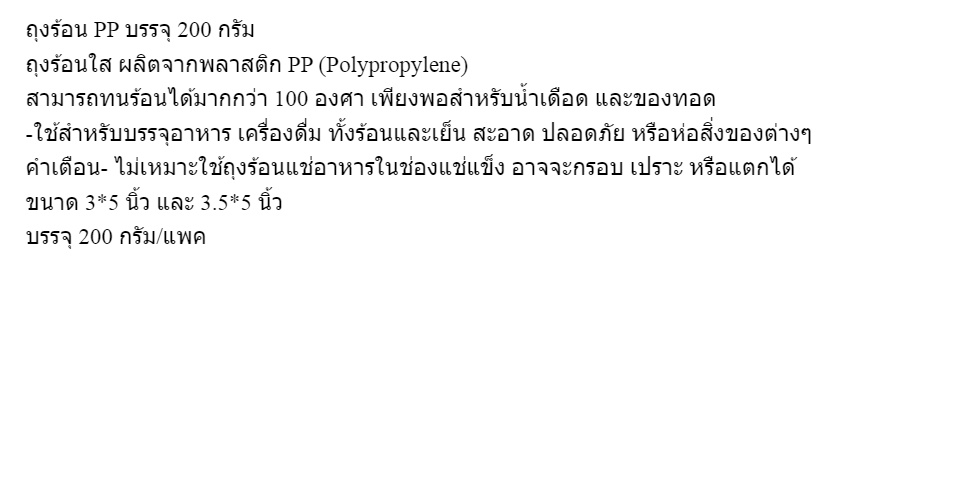 ถุงร้อน PP บรรจุ 200 กรัมถุงร้อนใส ผลิตจากพลาสติก PP (Polypropylene)สามารถทนร้อนได้มากกว่า 100 องศา เพียงพอสำหรับน้ำเดือด และของทอด-ใช้สำหรับบรรจุอาหาร เครื่องดื่ม ทั้งร้อนและเย็น สะอาด ปลอดภัย หรือห่อสิ่งของต่างๆคำเตือน- ไม่เหมาะใช้ถุงร้อนแช่อาหารในช่องแช่แข็ง อาจจะกรอบ เปราะ หรือแตกได้ขนาด 3*5 นิ้ว และ 3.5*5 นิ้วบรรจุ 200 กรัม/แพค