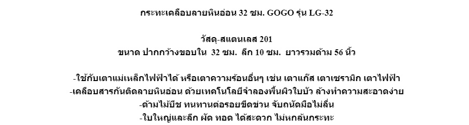 กระทะเคลือบลายหินอ่อน 32 ซม. GOGO รุ่น LG-32 วัสดุ-สแตนเลส 201 ขนาด ปากกว้างขอบใน 32 ซม. ลึก 10 ซม. ยาวรวมด้าม 56 นิ้ว -ใช้กับเตาแม่เหล็กไฟฟ้าได้ หรือเตาความร้อนอื่นๆ เช่น เตาแก๊ส เตาเซรามิก เตาไฟฟ้า -เคลือบสารกันติดลายหินอ่อน ด้วยเทคโนโลยีจำลองพื้นผิวใบบัว ล้างทำความสะอาดง่าย -ด้ามไม้บีช ทนทานต่อรอยขีดข่วน จับถนัดมือไม่ลื่น -ใบใหญ่และลึก ผัด ทอด ได้สะดวก ไม่หกล้นกระทะ