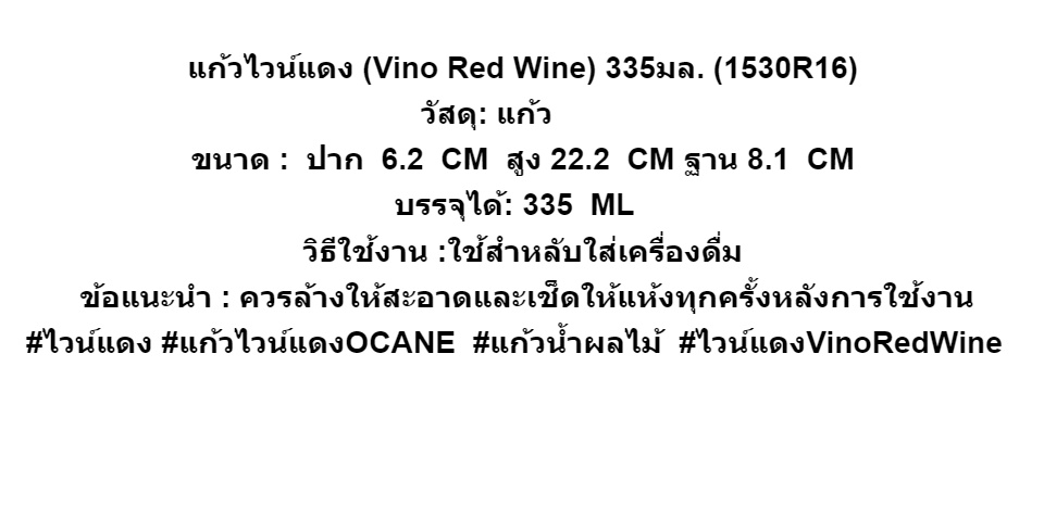 แก้วไวน์แดง (Vino Red Wine) 335มล. (1530R16)วัสดุ: แก้ว ขนาด : ปาก 6.2 CM สูง 22.2 CM ฐาน 8.1 CMบรรจุได้: 335 ML วิธีใช้งาน:ใช้สำหลับใส่เครื่องดื่ม ข้อแนะนำ : ควรล้างให้สะอาดและเช็ดให้แห้งทุกครั้งหลังการใช้งาน#ไวน์แดง #แก้วไวน์แดงOCANE #แก้วน้ำผลไม้ #ไวน์แดงVinoRedWine